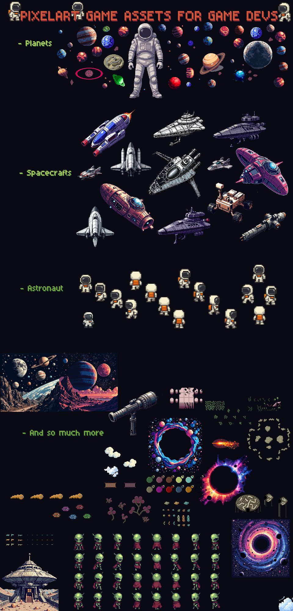- Added a whole 768x768 Pixelart sheet full of spacecrafts and planets to make your game more adorable. Thanks for everyone following me threw this project im glad for your support and If you look to the "GOALS" I will work also in future on this project. You can also follow me here on itch for upcomming asset packs.